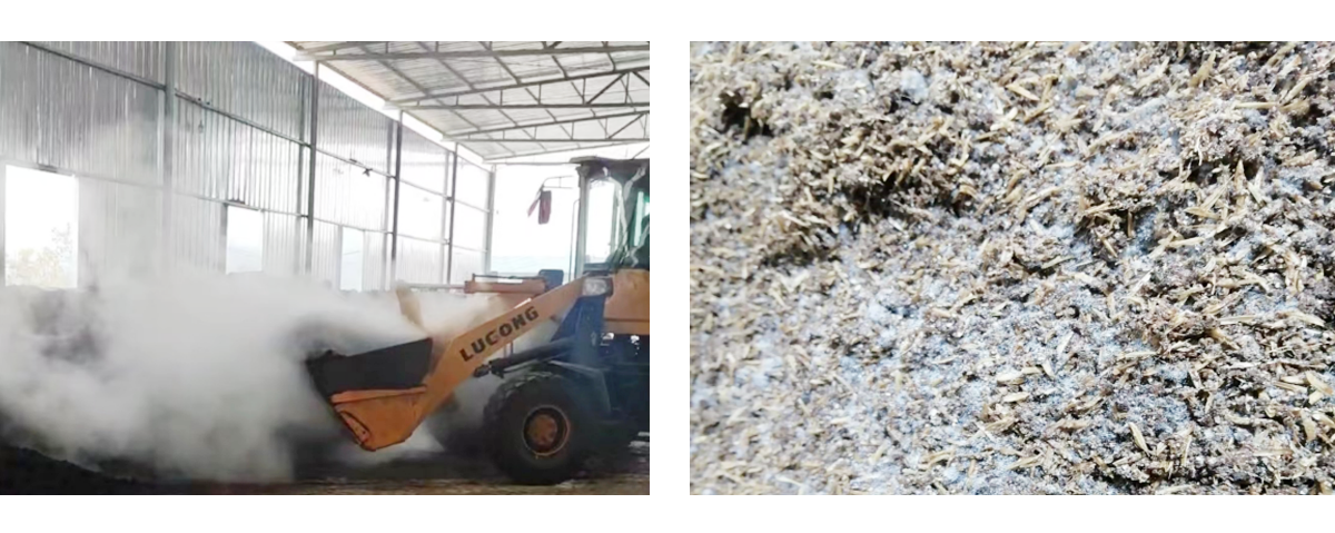 豬糞通過(guò)添加谷殼、鋸末、稻草渣調(diào)節(jié)水份至60%左右,利用有機(jī)肥發(fā)酵菌發(fā)酵,48小時(shí)溫度升高至60度以上,三天后發(fā)酵料基本無(wú)臭味。